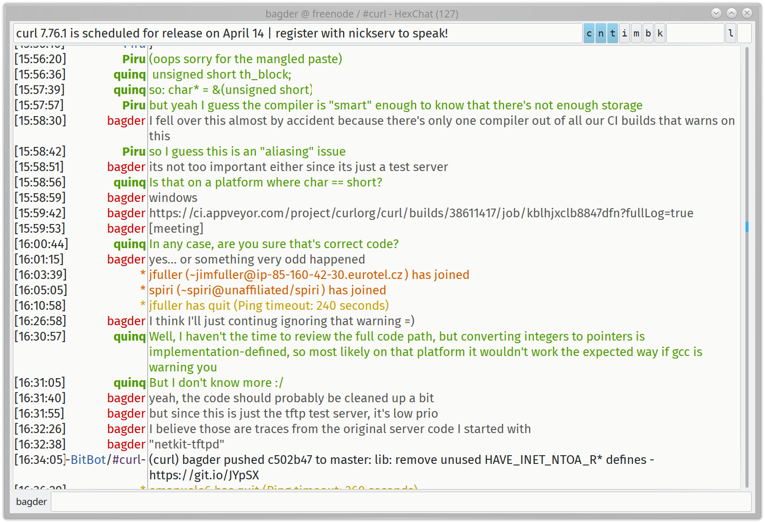 A screenshot example of a discussion in the #curl channel from early April 2021. Seen here in action is the Linux IRC client hexchat . The time stamps on the left are shown using the local time çone of Daniel ('bagder') Stemberg.