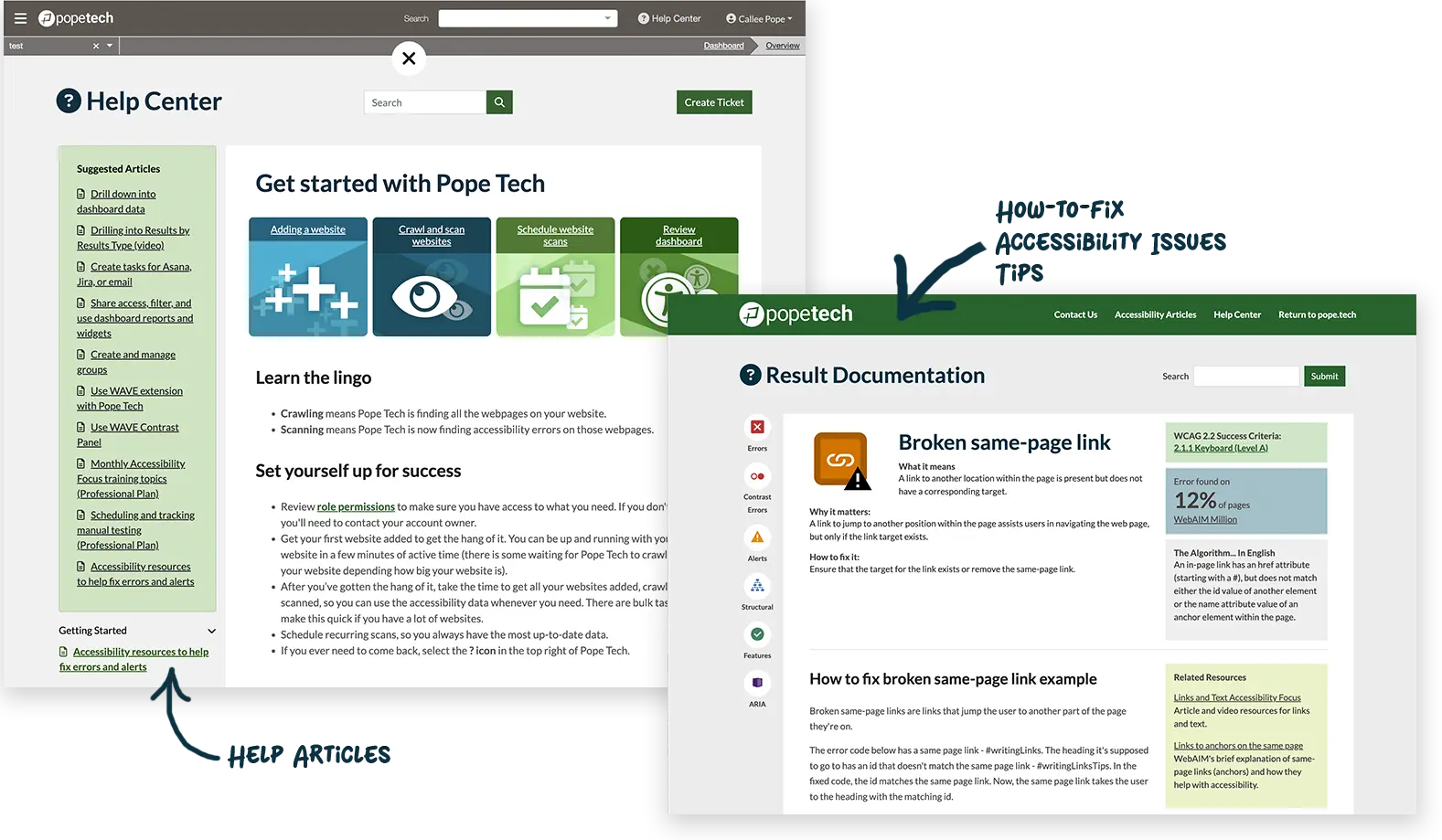 - Help Center library includes articles, videos on how to use Pope Tech.